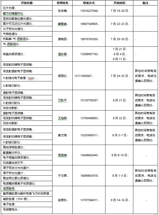 为满足学校师生科研工作的需要,在保证分析测试中心部分实验室改造工程顺利进展的前提下,中心经研究决定,暑假期间将对全校师生开放部分检测服务。广大师生可根据自己的研究进展,安排分析检测样品的送样和检测工作,需要预约的设备正常实行预约检测程序。以下是开放仪器及具体开放时间: