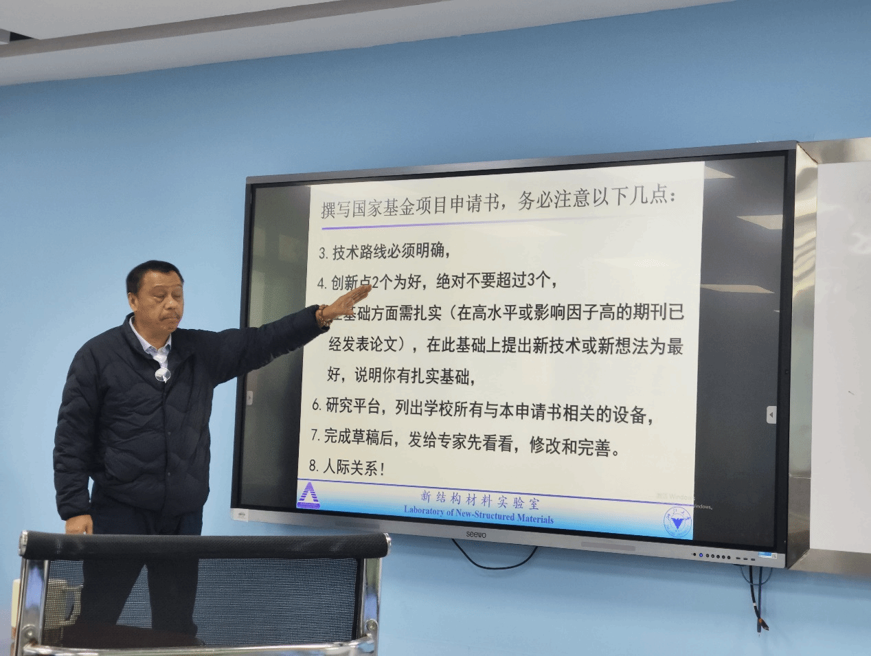 蒋建中教授首先介绍了金属玻璃领域的最新研究进展,随后以自身项目申报书为例子,向各位老师详细介绍了影响国家自然科学基金申报成功的关键因素,包括主观因素和客观因素。蒋老师强调,由主观因素导致的错误应尽量减少。在申报书的撰写方面,项目研究背景介绍应非常具体,不应太笼统,项目的关键科学问题和创新点应限制在2-3个,技术路线必须明确,研究平台可以把学校的相关平台都写进去。