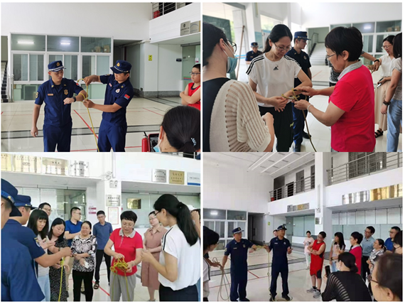 聂队长从亲历的各种消防救援行动中告诫师生,去到任何一个陌生的场所,要养成查看消防通道的习惯,并且坚决不占用消防通道——这是一条生命的通道,让师生们印象深刻。聂队长与他的同事们还从非常专业的角度介绍了消防器材的正确使用以及检查方法、疏散逃生中“小火快跑、大火关门”的原则以及逃生结的三种打结方法。师生们听得认真、学得认真。