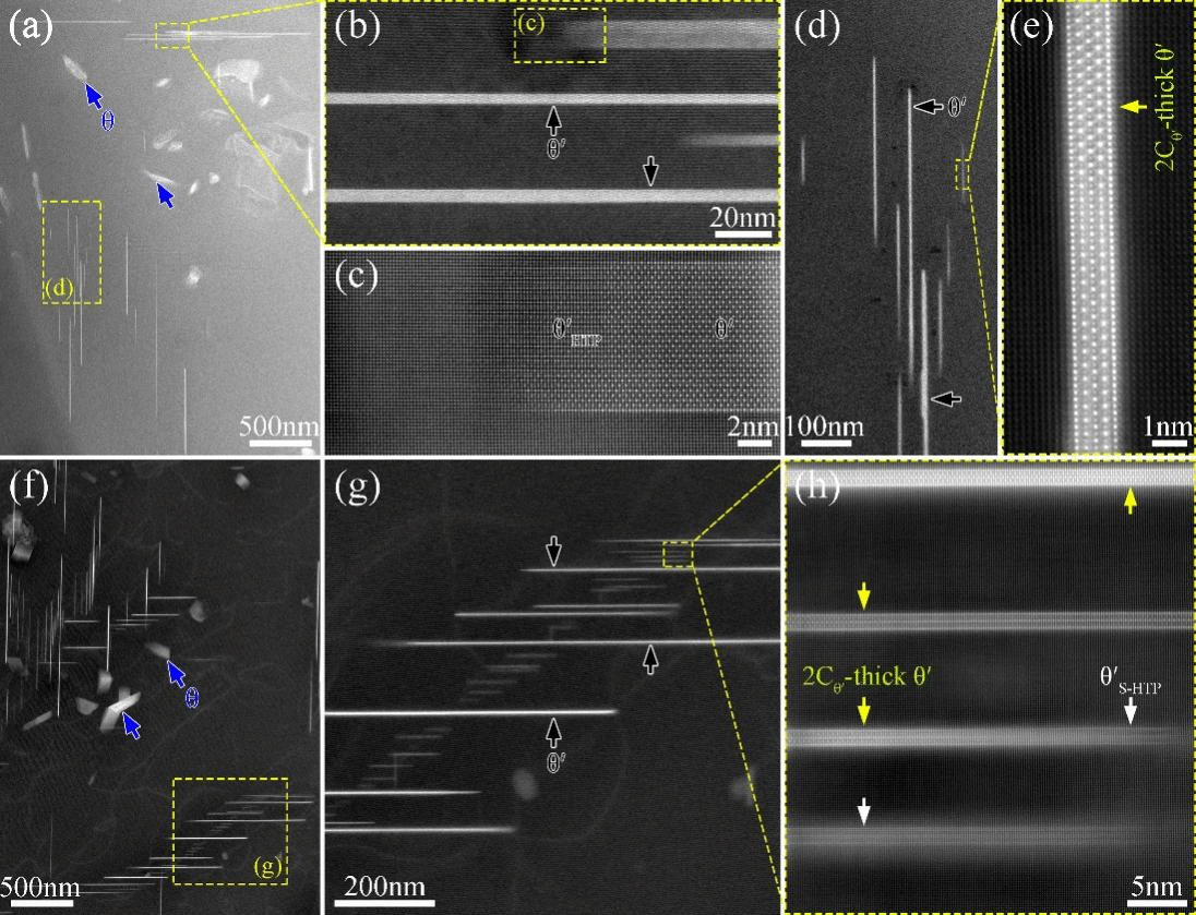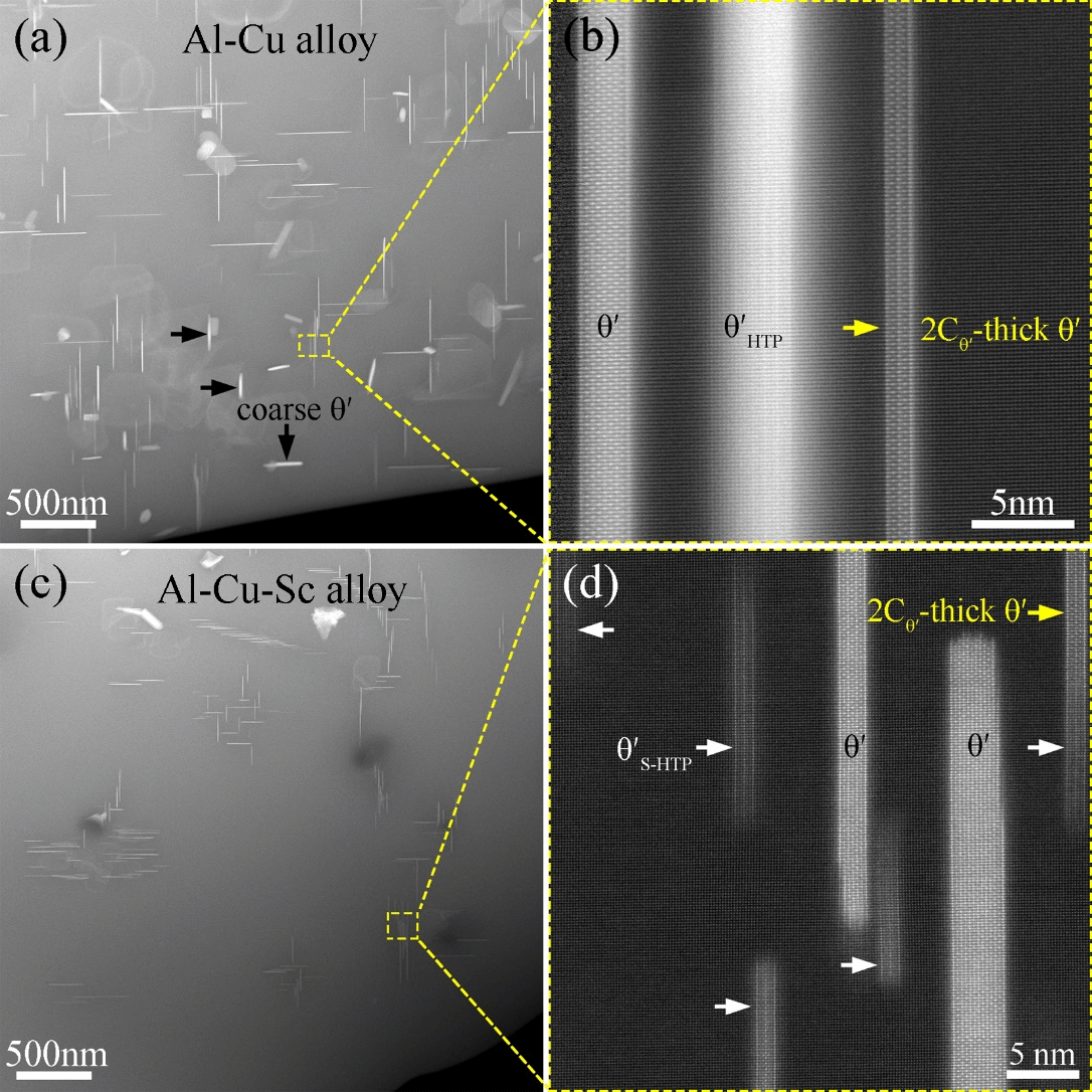 该研究通过原子分辨率的HAADF-STEM成像技术揭示了Al-Cu-(Sc)合金中主要强化相θ′的第二类高温前驱相及其析出转变规律。这一研究结果可为耐热Al-Cu合金的微结构设计提供新的见解。