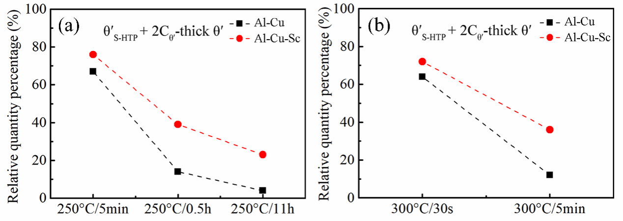 5的统计结果表明,Sc添加可以提高θ′S-HTP相的高温存活率,以至于进一步细化θ′相的尺寸并稳定其径厚比从而提升合金的高温热稳定性。