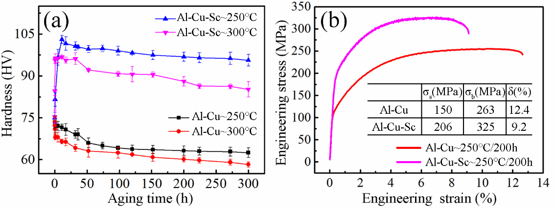 1a展示了Al-Cu-(Sc)合金在250℃300℃时效的硬化曲线。此时,Al-Cu合金已经失去时效强化效果,其过时效硬度甚至低于淬火态。然而,Al-Cu-Sc合金在250°C300°C的硬度平台仍分别维持在96HV85HV左右。因此,Sc微量添加明显提高了Al-Cu合金的高温抗软化能力。通过对比两种合金在250°C/200h时效后的工程应力-应变曲线1b可知,含Sc合金的屈服强度、抗拉强度均高于Al-Cu合金,即再次验证了Sc添加增强Al-Cu合金的高温热稳定性。