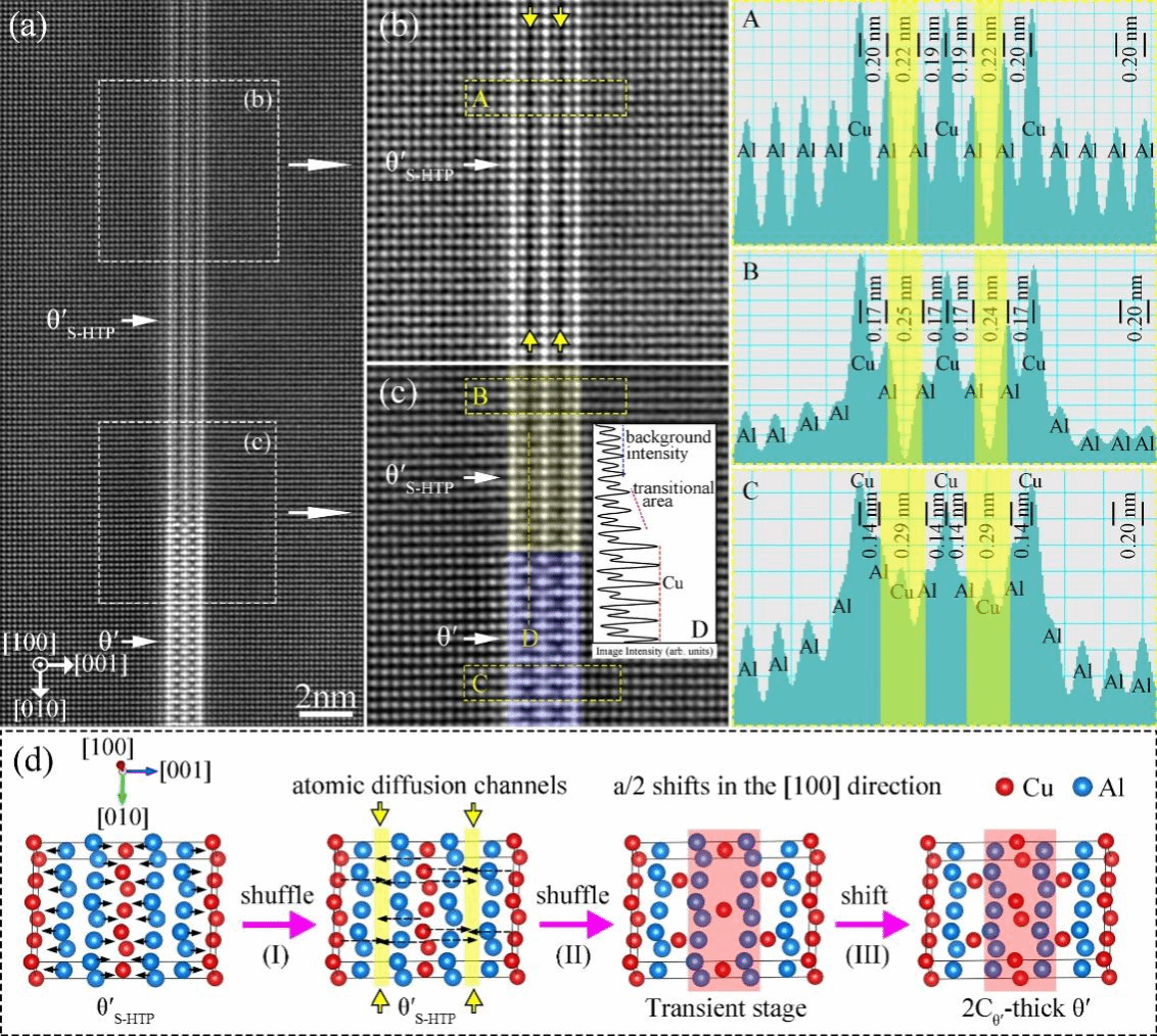 4θ′S-HTP/θ′相的HAADF-STEM高分辨像,其证实了Al-Cu-(Sc)块体合金在高温时效形成的θ′S-HTP相可以直接转变为θ′相。在相转变初期(I阶段)θ′S-HTP相中的两相邻Al原子层沿[001]Al[00-1]Al方向互相移动0.10~0.25Å以形成Cu原子扩散通道(0.2~0.5Å)。随后,θ′S-HTP相中的Cu原子(尤其是共格界面处的间隙Cu原子)会迁移至原子扩散通道,逐渐形成相转变过渡结构(II阶段)。最终,过渡结构中的Al-Cu-Al原子层(粉红色阴影区域)沿[100]Al方向平移a/2(aAl基体的晶格常数),即直接转变为两个单胞厚的θ′相。