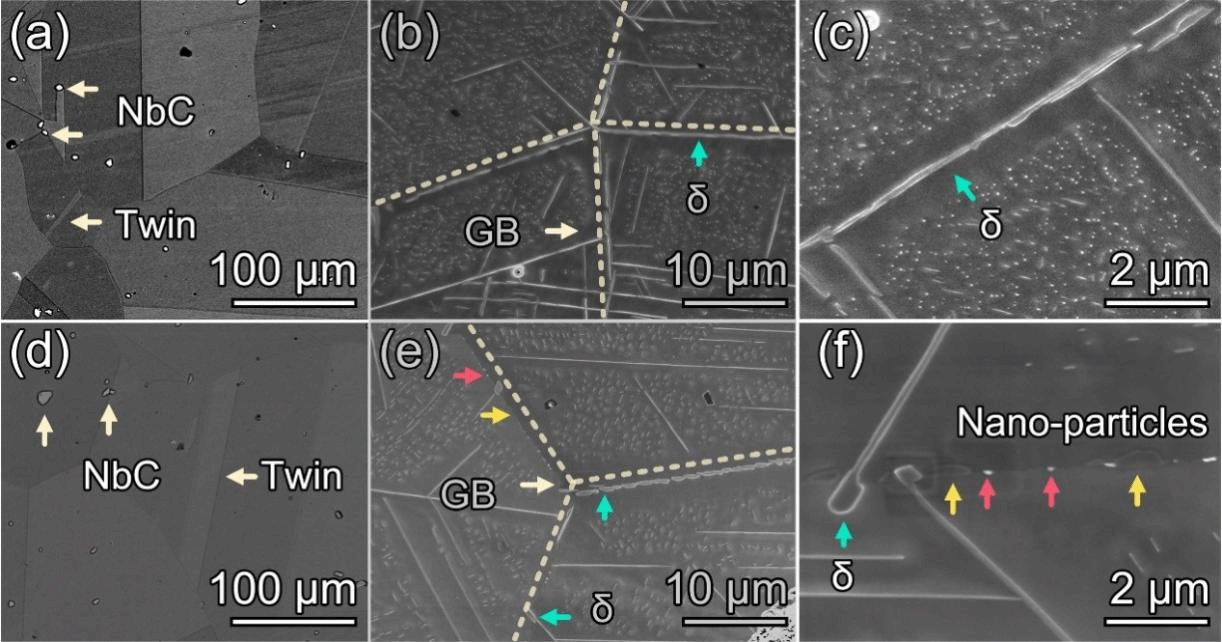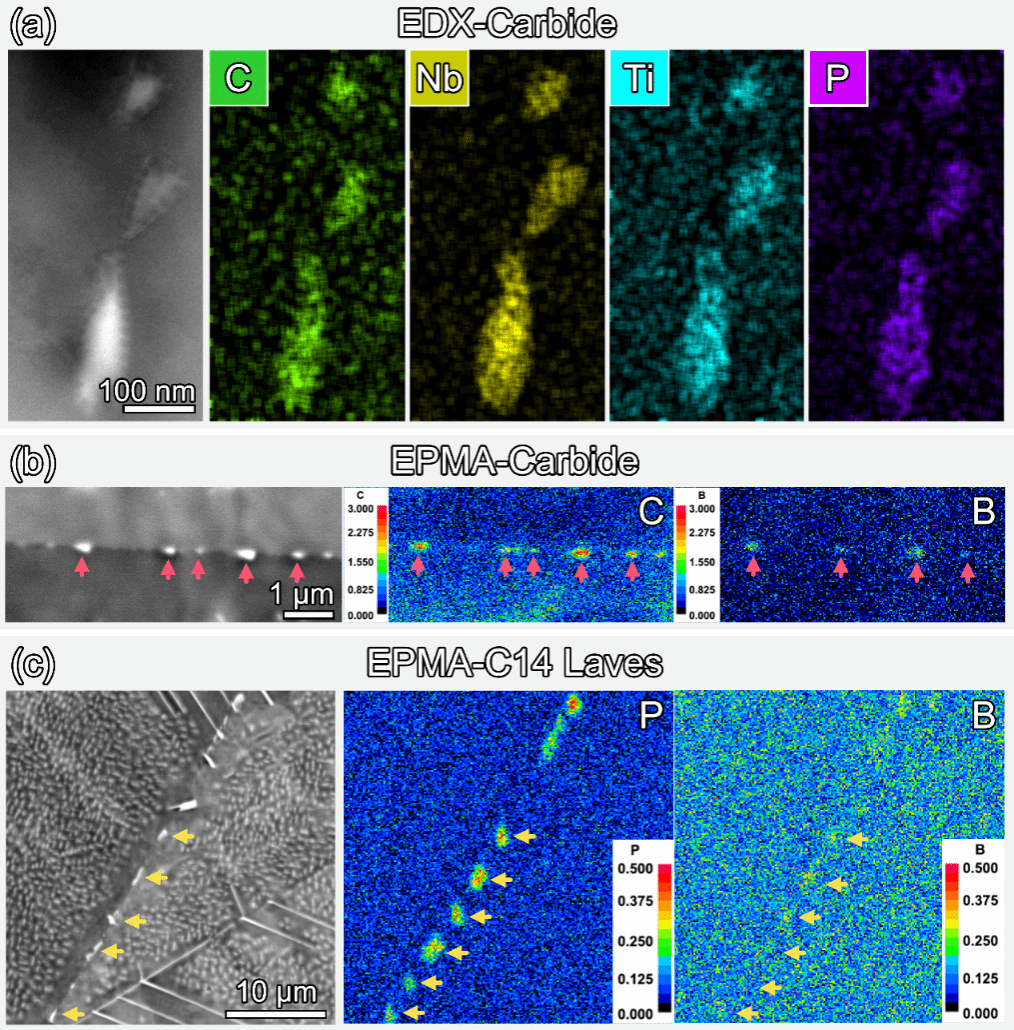 晶界析出物形态变化:通过HAADF-STEM成像,研究团队发现PBC合金中的晶界析出行为发生了显著变化。从无P/B合金中连续的δ相“薄膜”转变为不连续的多相析出相。这种微观结构的转变有效提高了合金的高温性能,减少了脆性断裂的风险。