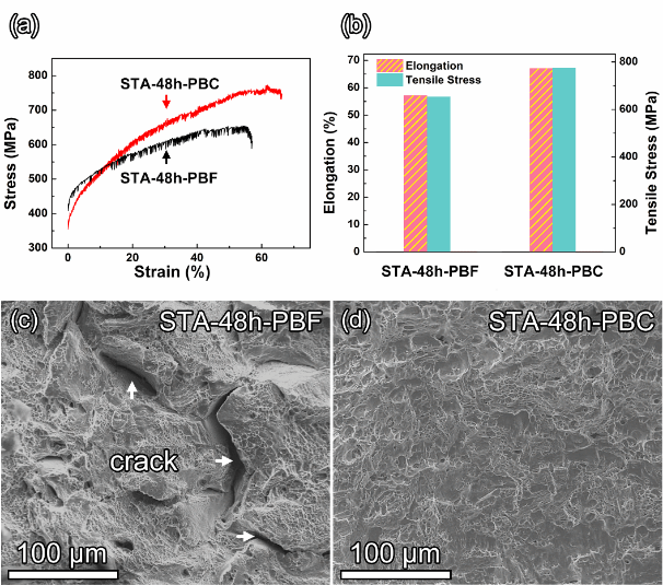 图1 (a,b)650°C时PBF与PBC合金的力学性能;(c,d)PBF与PBC合金的断裂形态。