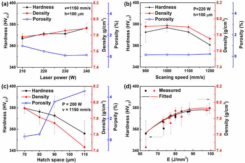 图3 (a) LPBF马氏体时效钢的硬度、密度和孔隙率分别随激光功率、(b)打印间距和(c)扫描速度的变化曲线。(d) LPBF马氏体时效钢的硬度和密度与能量密度(E)的变化关系。