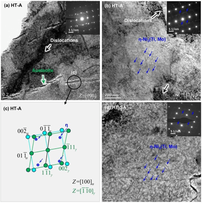 图11(a, b) HT-A样品的低、高倍TEM图像。(c)是 (a)中HT-A样品的SAED示意图。(d) HT-SA样品的高倍TEM,表明在马氏体基体中形成了反转奥氏体和纳米析出相。