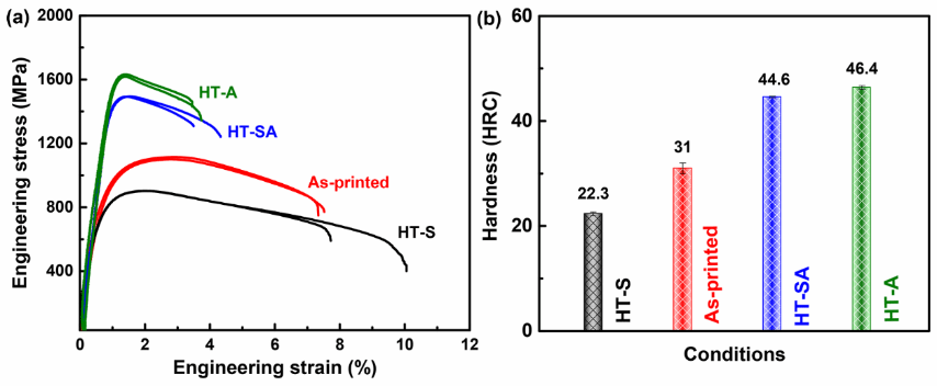 图8 (a)不同热处理条件下LPBF马氏体时效钢的工程应变-应力曲线。(b)不同热处理条件下LPBF马氏体时效钢的洛氏硬度。