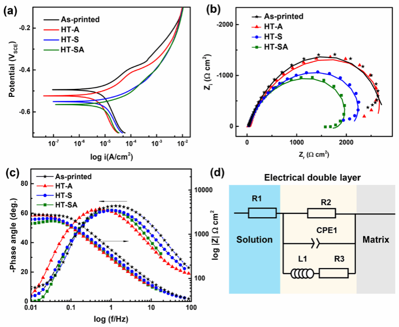 图9 (a)不同热处理条件下LPBF马氏体时效钢的极化曲线。(b) Nyquist图。(c) Bode图。(d)实验数据的拟合等效电路图。