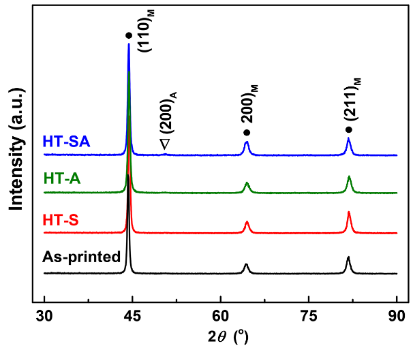 图7 不同热处理条件下LPBF马氏体时效钢的XRD谱图。