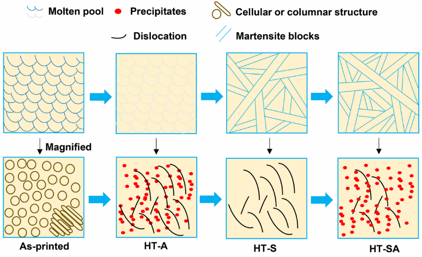 图12 不同热处理条件下LPBF马氏体时效钢组织演变示意图。底部一行对应于顶部一行的放大图。