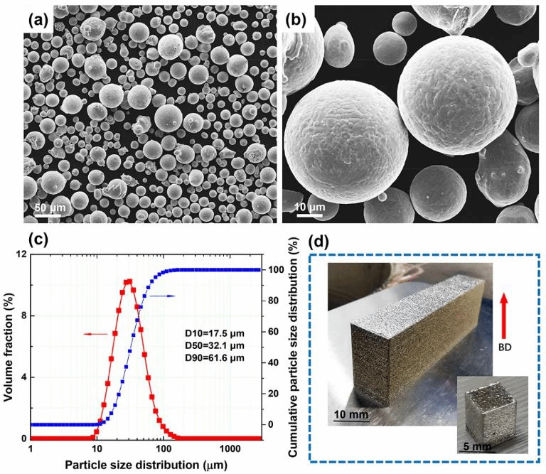 图1 (a, b)马氏体时效钢粉的低倍和高倍SEM图像。(c)粒径分布和累积粒径分布。(d) LPBF打印样品的数码照片。