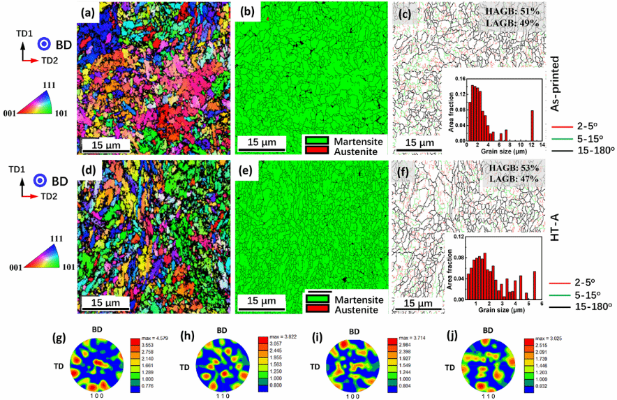 图6(a,b和c)为打印样品的EBSD反极图、相图和晶界图,(c)中插图为晶粒尺寸分布;(d,e和f) HT-A样品的EBSD反极图、相图和晶界图,(f)中的插图显示了晶粒尺寸分布。(g, h)打印样品的极图(PF)。(i, j) HT-A样品的PF。