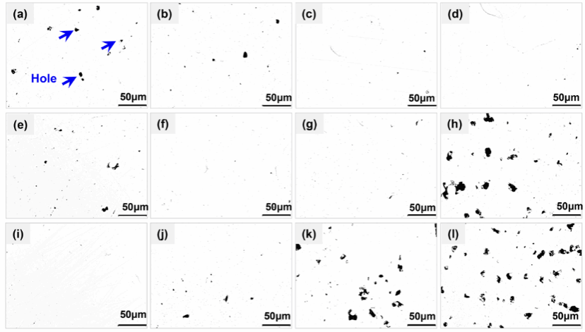 图2 不同参数下LPBF马氏体时效钢的光学显微照片。(a-d)激光功率范围为210 ~ 240 W;(e-h)扫描速度范围为900 ~ 1200 mm /s。(i- 1)打印间距范围为70 ~ 110 μm。