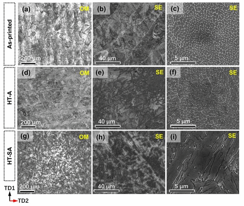 图4(a-c)打印态样品的金相显微照片(OM)和扫描电镜(SEM)的低倍和高倍率图像;(d-f) HT-A样品的OM和SEM的低倍和高倍率图像;(g-i) HT-SA样品的OM和SEM的低倍和高倍率图像。